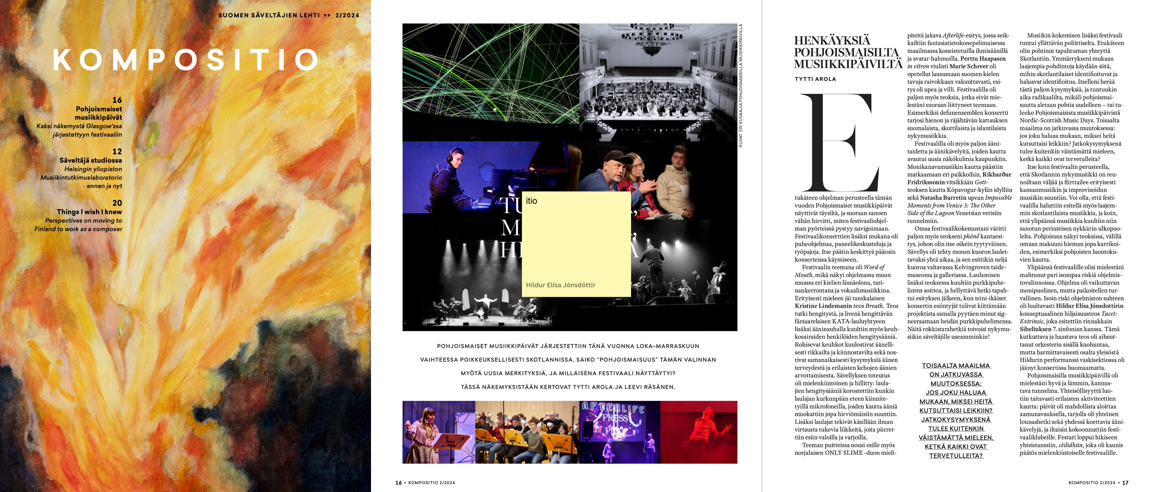“Overall, I think the festival [Nordic Music Days 2024 in Glasgow] could have taken a couple of bigger risks in its program choices. The program was impressively diverse, but in places safe. The biggest risk in terms of the program was probably Hildur Elísa Jónsdóttir's conceptual work of silence, Tacet: Extrinsic, which was performed alongside Sibelius's 7th Symphony. This provocative and challenging work had caused a stir within the orchestra. Still, unfortunately for some of the audience, Hildur's performance in the brass section had gone unnoticed in the concert.” Excerpt from ‘Breaths from the Nordic Music Days’, published in Kompositio, Suomen Säveltäjien Lehti No. 2 (2024). Full article in Finnish here.