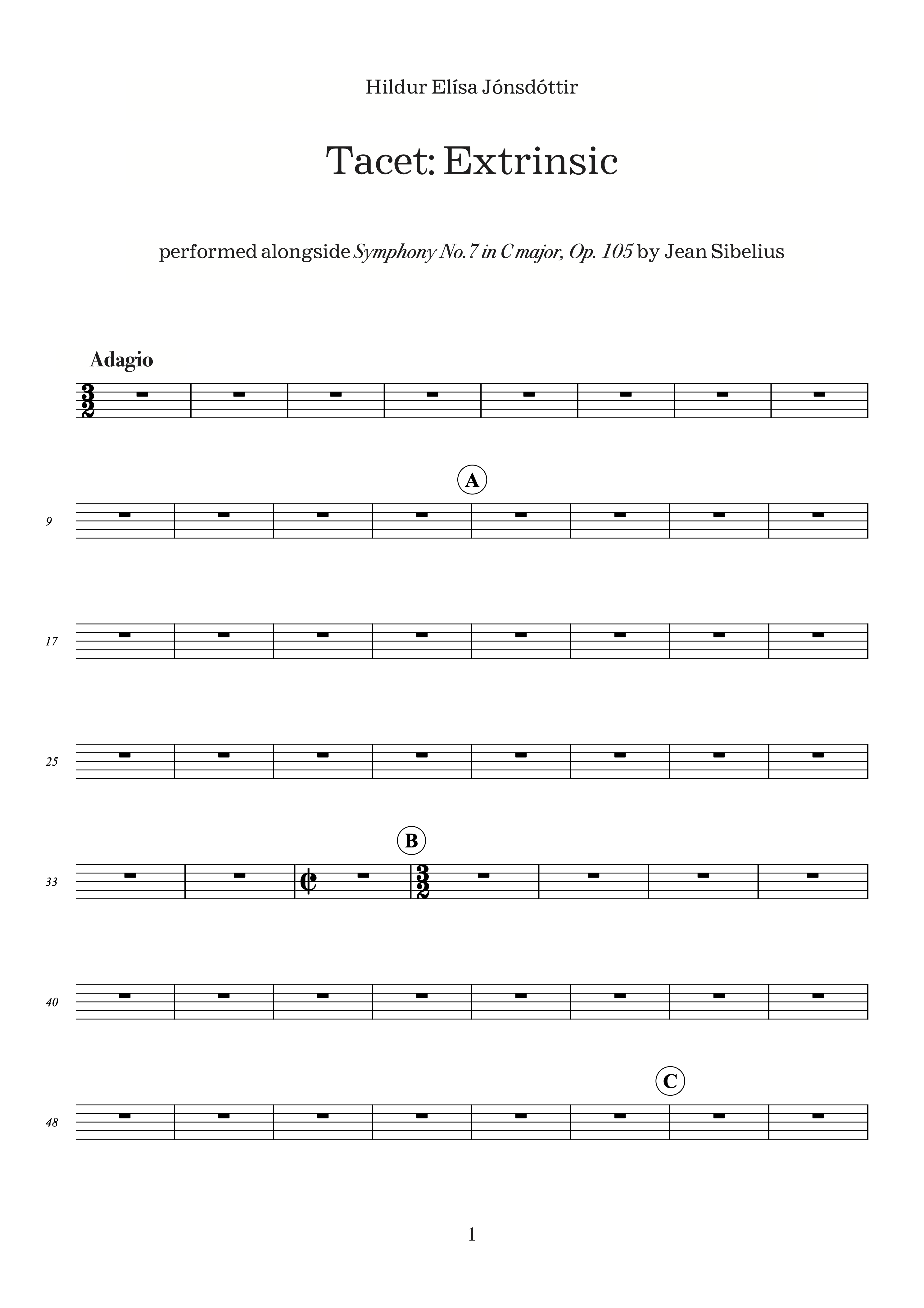 Tacet: Extrinsic (Silence: External) is a durational piece for a silent performer sitting within an orchestra, or an ensemble, through a concert. The silent performer is indistinguishable from any other performers on the stage except for the fact that they (the silent performer) never pick up an instrument or make a sound. By performing silence which is not integral to a composition while sitting within an orchestra - whose performers perform both sound and silence - the artist gets the viewer to reflect on the importance of sound and silence in music and their interplay, and their role as